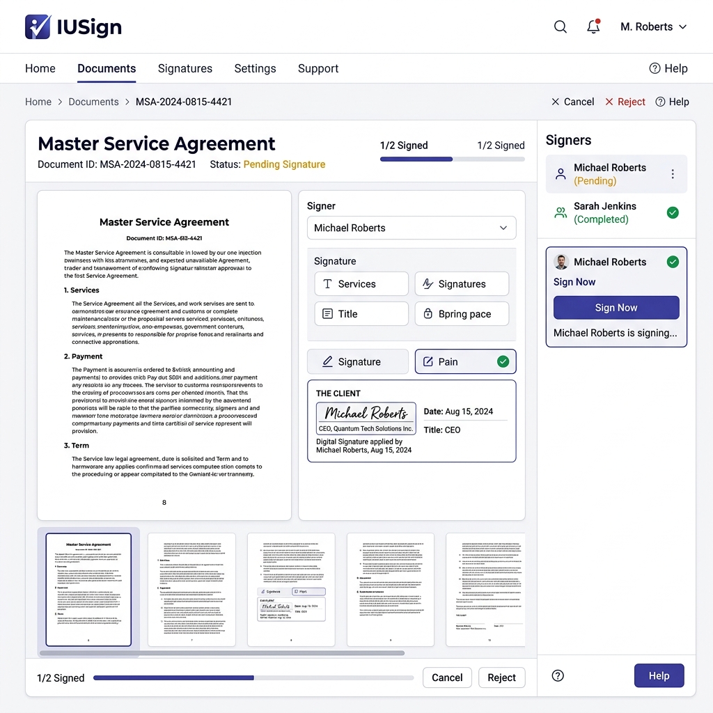 Drag-and-drop signature, text, date, and checkbox fields directly onto your PDF. Upload PDF or DOCX — automatic conversion via LibreOffice.