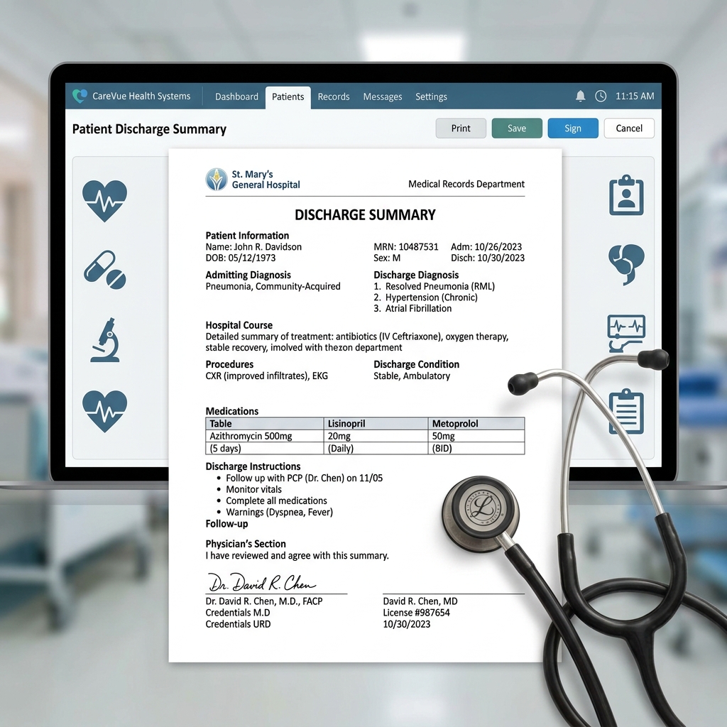 Physicians and nurses often delay discharges waiting for manual signatures, increasing per-patient costs. Doctor signs once, auto-inject patient data, send to patient + PCP instantly.